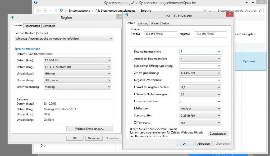 Dies ist zwar nicht unbedingt ein Tutorial, aber bei einer frischen Installation von Windows 8.1 Pro ist das Dezimaltrennzeichen der Ländereinstellung Deutsch-Schweiz falsch. Standardmässig ist es ein Komma anstatt ein Punkt. Ich verstehe das echt nicht warum Microsoft das verschlimmbessert hat. Sind die echt zu doof oder tun die nur so? Vielleicht haben die auch etwas gegen Schweizer, wer weiss ![]()